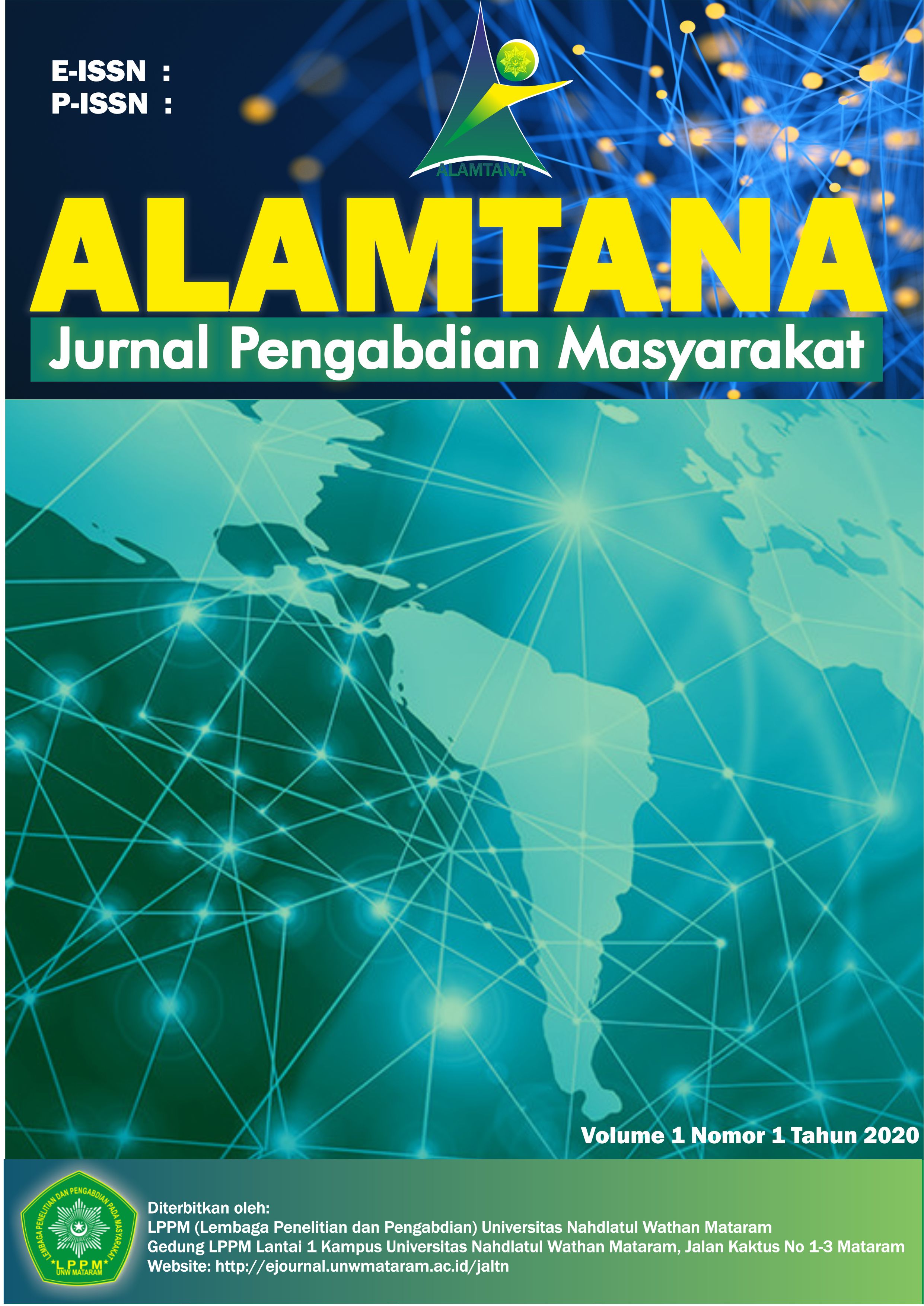 Vol 1 No 1 (2020)urnal ALAMTANA merupakan jurnal ilmiah yang diterbitkan oleh Lembaga Penelitian dan Pengabdian Masyarakat (LP2M) Universitas Nahdlatul Wathan Mataram dengan e-ISSN 2722-6751 . Jurnal ALAMTANA memuat artikel hasil pengabdian para dosen, akademisi, dan mahasiswa dalam membantu dan lembaga sumber daya, pertimbangan, tantangan, dan masalah yang ada di masyarakat. Implementasi kegiatan layanan juga melibatkan Partisipasi masyarakat dan mitra. Kegiatan pelayanan diorganisasikan menjadi kegiatan yang meningkatkan kesejahteraan masyarakat.